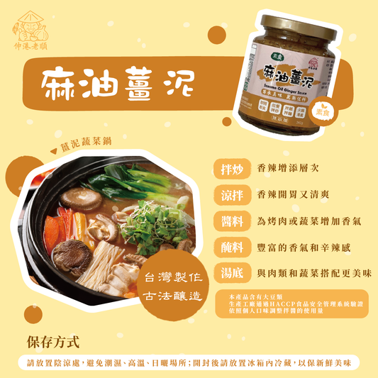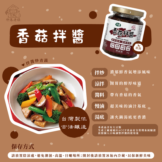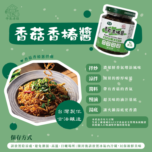 伸港老順的拌醬種類豐富,目前有六種:XO海鮮干貝醬、紅蔥酥拌醬、香菇拌醬、香菇香椿醬、麻油薑泥、黑豆蔭豆鼓,其中就包含4種純素拌醬,未來將開發更多封為滿足大家的口味!